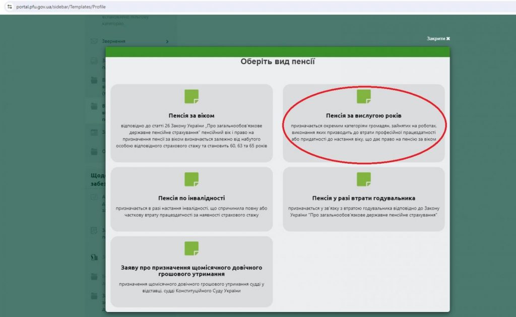 11. Оберіть вид пенсії (наприклад "Пенсія за вислугу років").