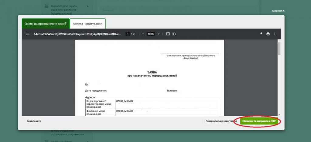 14. Для завершення всіх операцій підпишіть заяву за допомогою Дія.Підпису та відправте до Пенсійного фонду України, натиснувши кнопку "Підписати та відправити до ПФУ".