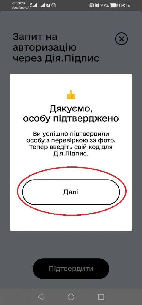 6. Підтвердьте свою особу через перевірку за фото, керуючись підказками телефона, та натисніть "Далі".