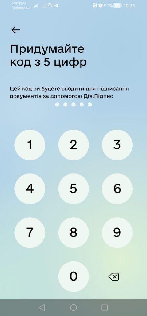 7. Введіть на телефоні п’ятизначний код для накладання Дія.Підпис. Якщо ви використовуєте Дія.Підпис вперше, то його необхідно запам’ятати.
