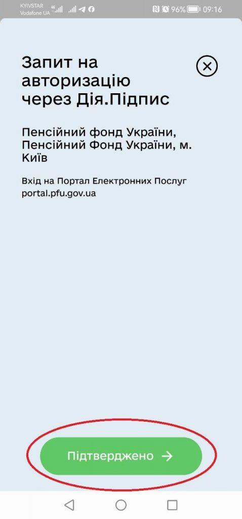 8. Якщо всі кроки пройдено успішно, запит на авторизацію через Дія.Підпис для входу на вебпортал ПФУ буде підтверджено і на екрані телефона з’явиться відповідний напис.
