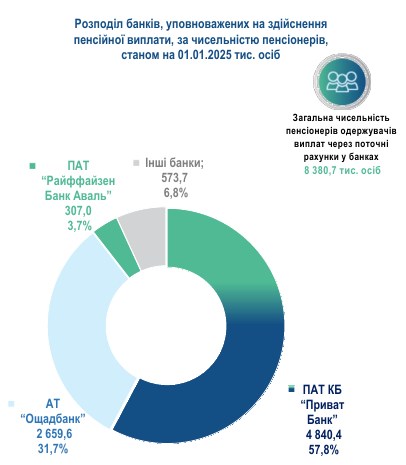 Станом на 1 січня 2025 року частка ПриватБанку у виплаті пенсій становить 57,8%. У цьому держбанку отримують гроші 4,840 млн осіб. На другому місці державний Ощадбанк (31,7%, пенсії отримують 2,660 млн осіб).