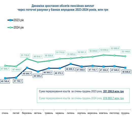 За даними ПФУ, сума перерахування коштів через банки за січень-грудень 2024 року склала 616,89 млрд гривень, що на 11,9% більше, ніж у 2023 році (551,21 млрд гривень).