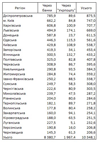За даними ПФУ, найбільше пенсіонерів було в Дніпропетровській області 875,5 тисяч осіб. Крім того, у Києві 747,0 тисяч пенсіонерів, у Харківській області - 707,7 тисяч, у Львівській області - 669,0 тисяч, у Донецькій області - 611,5 тисяч, осіб.