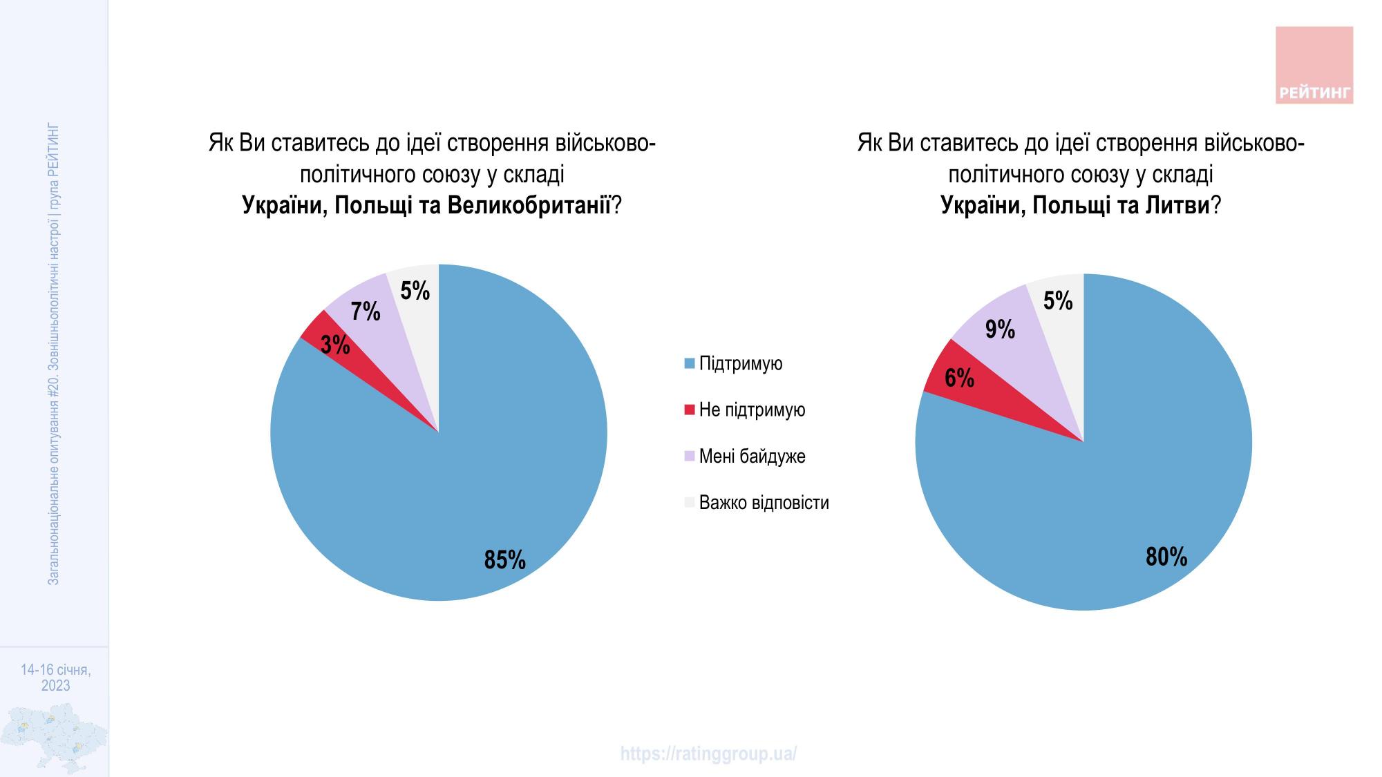 Крім того, 85% опитаних підтримують ідею створення військово-політичного союзу у складі України, Польщі та Великобританії. Проти такої ініціативи 3%, байдуже - 7%.