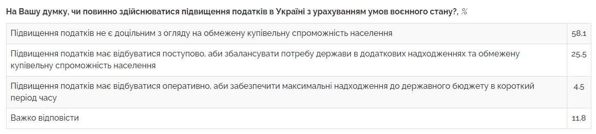 Лише 4,5% українців вважають, що підвищення податків має відбуватися оперативно, аби забезпечити максимальні надходження до державного бюджету в короткий період часу.
