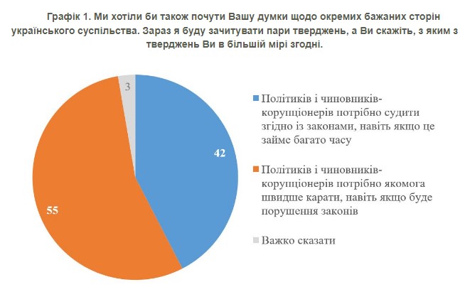 Більше половини українців (55%) хочуть якомога швидшого покарання корупціонерів, навіть якщо це буде через порушення законів. Іншої думки, що треба карати за законом, навіть якщо це займе багато, дотримуються 42% українців.
