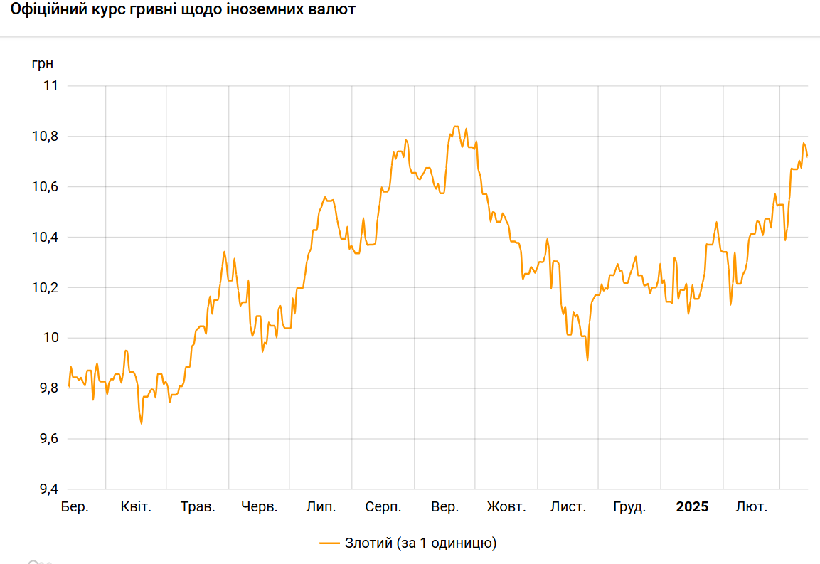 Офіційний курс на 14 березня 2025 року встановлено на такому рівні: 10,7194 гривень за 1 злотий (-0,0453 грн).