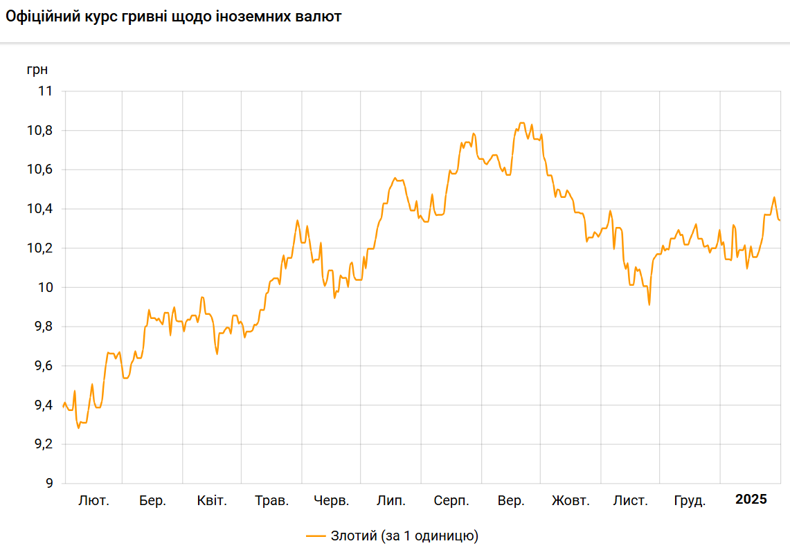 Офіційний курс на 31 січня 2025 року встановлено на такому рівні: 10,3433 гривень за 1 злотий (-0,0058 грн).