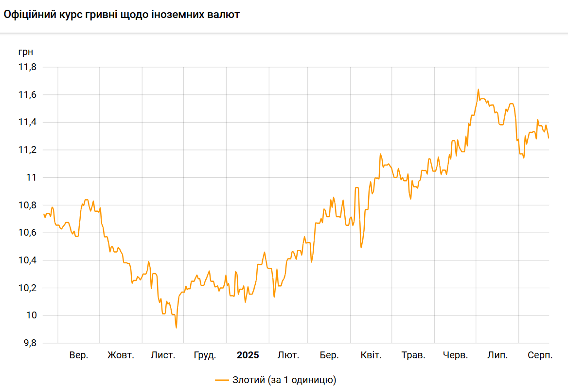 Офіційний курс на 22 серпня 2025 року встановлено на такому рівні: 11,2862 гривень за 1 злотий (-0,0525 грн).