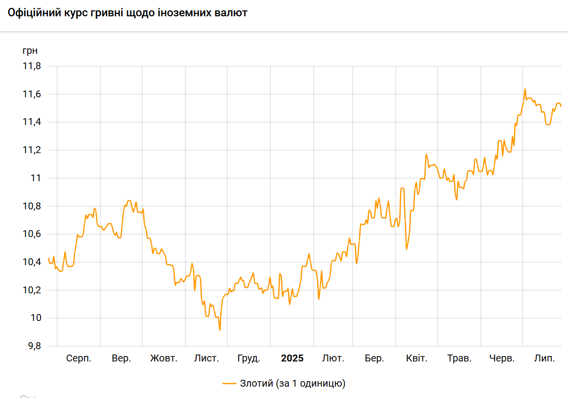 Офіційний курс на 28 липня 2025 року встановлено на такому рівні: 11,5106 гривень за 1 злотий (-0,0266 грн).