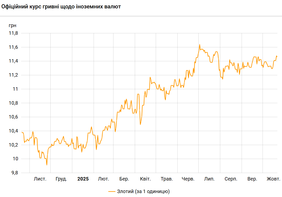 Офіційний курс на 21 жовтня 2025 року встановлено на такому рівні: 11,4605 гривень за 1 злотий (-0,0185 грн).