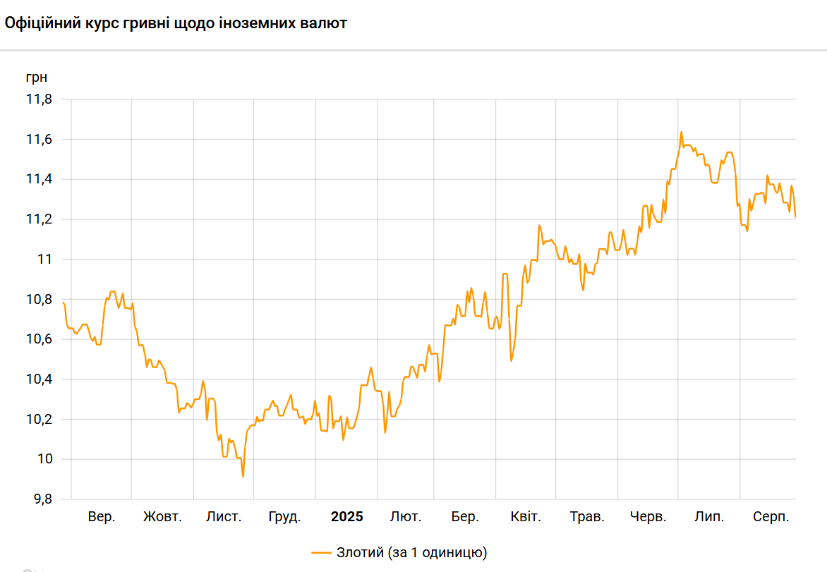 Офіційний курс на 28 серпня 2025 року встановлено на такому рівні: 11,2103 гривень за 1 злотий (-0,1182 грн).
