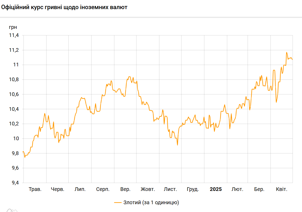 Офіційний курс на 30 квітня 2025 року встановлено на такому рівні: 11,0733 гривень за 1 злотий (-0,0126 грн).