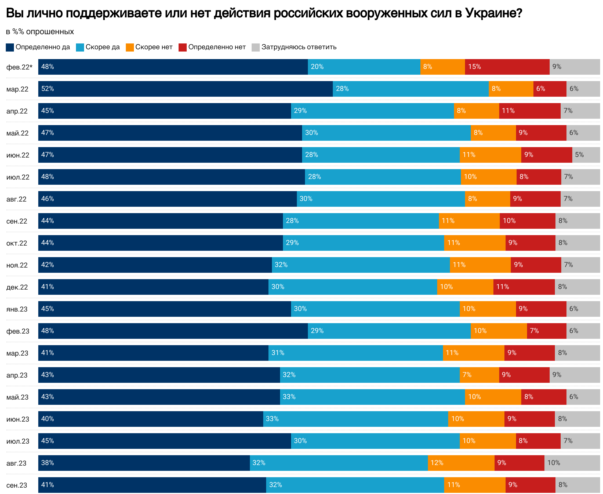 У вересні підтримка війни значно не змінилася: 73% схвалюють вторгнення в Україну (у серпні - 70%). Не підтримують 20% (у серпні - 21%).