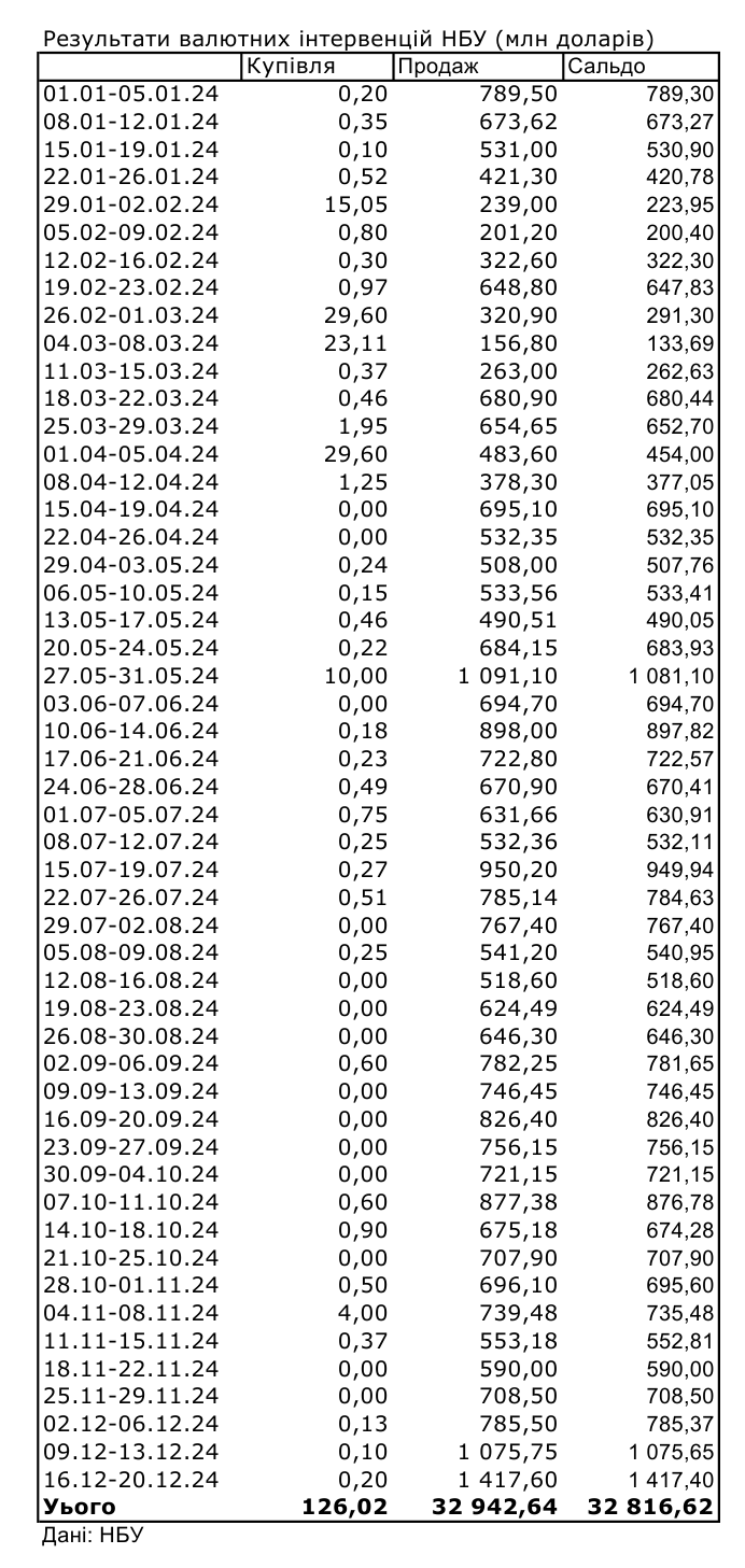 НБУ протягом тижня 16-20 грудня 2024 року продав на міжбанківському валютному ринку 1,417 млрд доларів. Це максимальний обсяг із 2022 року, коли НБУ за 23-27 травня продав 1,424 млрд доларів