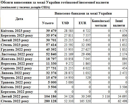За даними НБУ, у квітні з України вивезли 39,5 млн доларів, що на 3,5 млн доларів більше, ніж у березні.