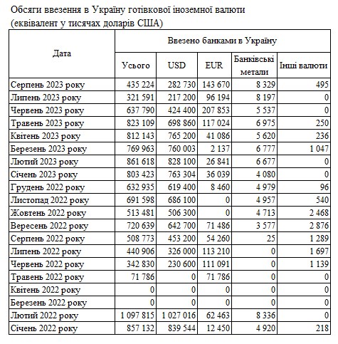 Обсяг готівкової іноземної валюти, яку банки ввезли до України у серпні 2023 року, становив 435 млн доларів. Це на 35% більше, ніж у липні (322 млн доларів).