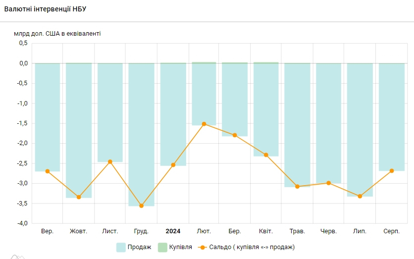 Національний банк України у серпні 2024 року продав на міжбанківському валютному ринку 2,679 млрд доларів, що на 19,2% менше, ніж у липні (3,316 млрд доларів).
