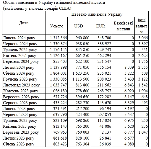 Обсяг готівкової іноземної валюти, яку банки ввезли до України у липні 2024 року, становив 1,313 млрд доларів. Це на 1,4% менше, ніж у червні (1,331 млрд доларів).