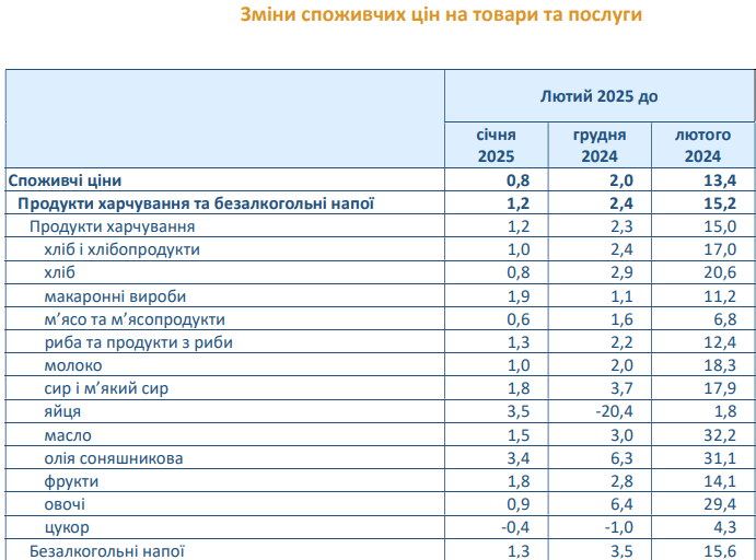 Середні ціни на продукти харчування та безалкогольні напої в Україні в лютому 2025 року порівняно з лютим минулого року зросли на 15,2%. Подорожчали всі продукти.
