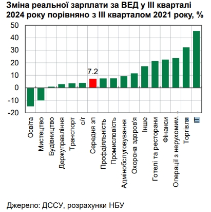 За розрахунками НБУ, у більшості видів економічної діяльності (за винятком освіти та мистецтва), реальні зарплати є вищими, аніж у ІІІ кварталі 2021 року (до повномасштабного вторгнення).