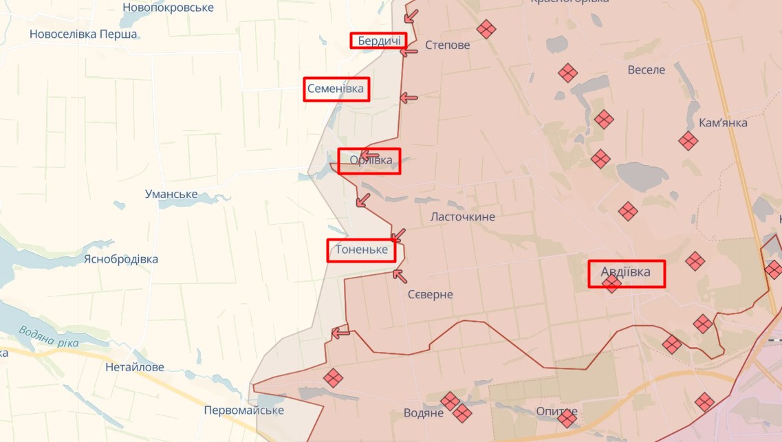Ситуація під Авдіївкою залишається максимально складною. За два тижні фронт змістився орієнтовно на 5 км на захід, а оборона - на лінію Бердичі-Орлівка-Тоненьке. Минулого тижня окупанти прорвалися на околиці Орлівки, але були вибиті силами 3-ї штурмової та 25-ї окремої повітряно-десантних бригад.
