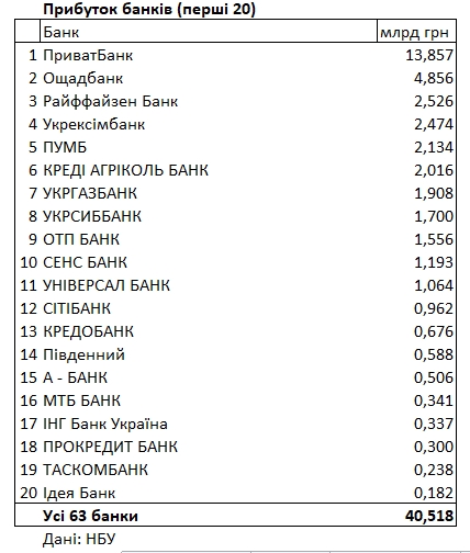 За даними НБУ, 55 із 63 банків отримали прибуток на суму 40,630 млрд гривень, а вісім банків показали збитки на 111 млн гривень.