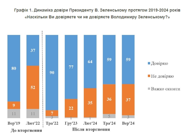 У вересні-жовтні 2024 року 59% українців довіряють президенту Володимиру Зеленському, 37% - не довіряють. З травня показники практично не змінилися.