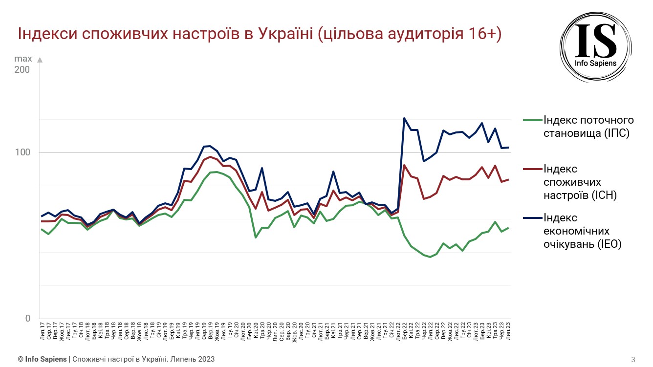"У липні 2023 року, після суттєвого зниження показників за усіма складовими індикатора у минулому місяці, ми фіксуємо стабілізацію ситуації і навіть незначне зростання за більшістю показників. Протягом липня фіксується незначне зростання як індексу споживчих настроїв, так і індексів поточного становища та економічних очікувань. Можемо припустити, що населення знаходиться у "режимі очікування". Ми продовжуємо надалі спостерігати за ситуацією і оцінювати динаміку лише на довших часових проміжках", - коментують аналітики Info Sapiens.