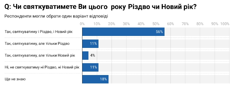 Лише Різдво святкуватиме 11% опитаних, а лише Новий рік - 4%. Більшість респондентів (56%) святкуватиме Різдво, і Новий рік.