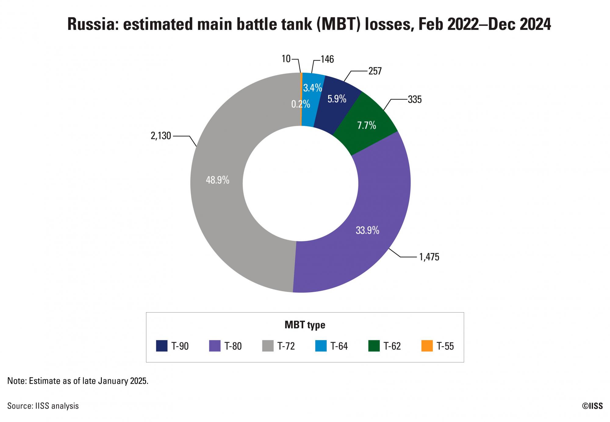 За оцінками IISS на початок січня 2025 року, щонайменше 172 тисячі російських військових було вбито і 611 тисяч поранено, з яких щонайменше 376 тисяч дістали тяжкі поранення (інваліди), а загальна кількість поранених, але таких, що підлягають одужанню, досягла 235 тисяч осіб.
