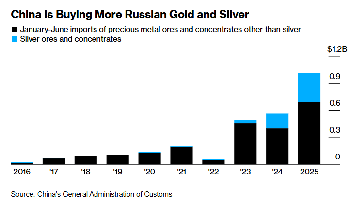 За даними Trade Data Monitor, отриманими від митної служби Китаю, імпорт до Китаю російських руд і концентратів дорогоцінних металів, включно із золотом і сріблом, зріс на 80% до 1 млрд доларів порівняно з аналогічним періодом минулого року.