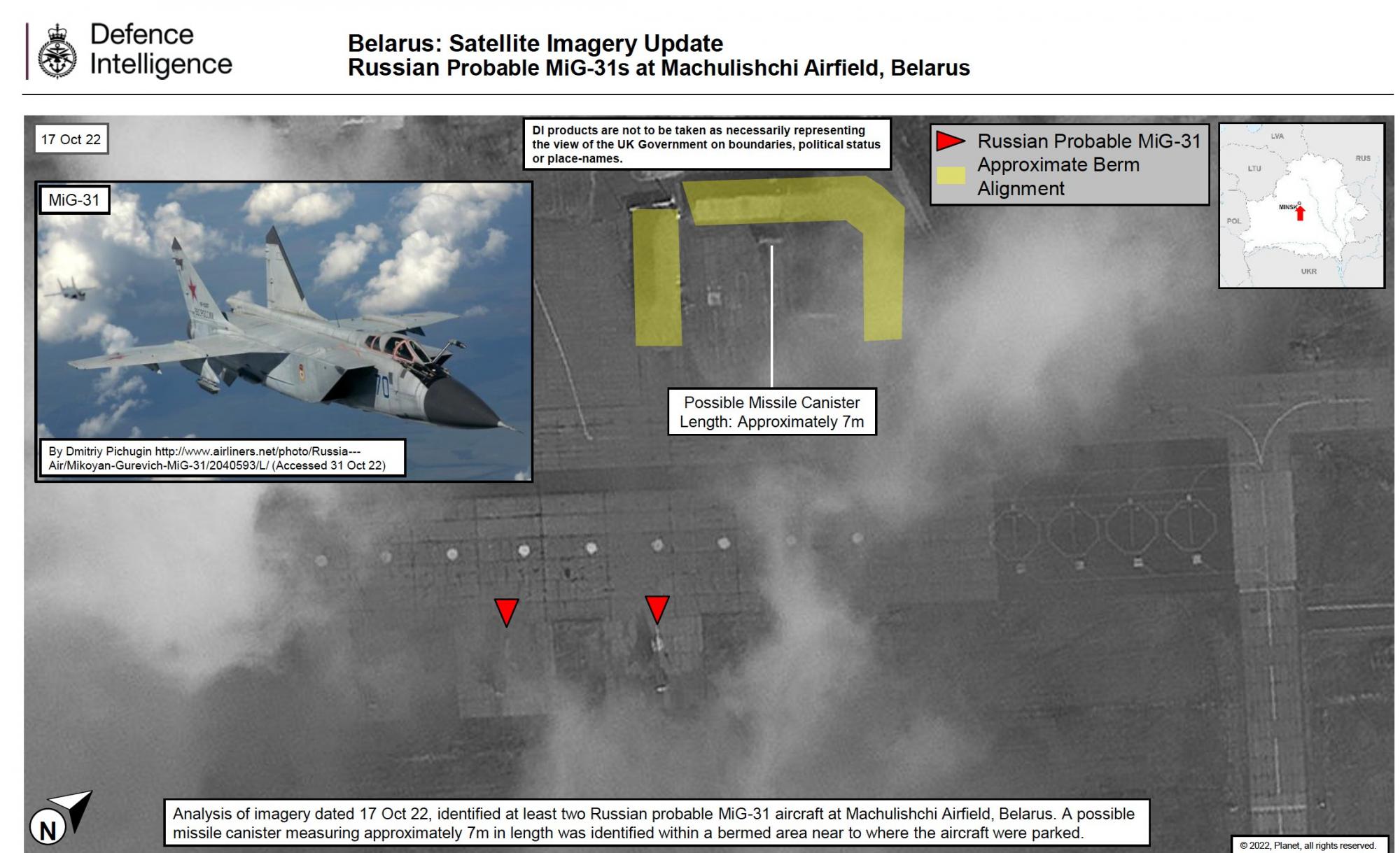 Британська розвідка публікує супутникові знімки білоруського ародрому Мачулищи, де припарковані два винищувачі МіГ-31К, які здатні нести ракети "Кинджал".