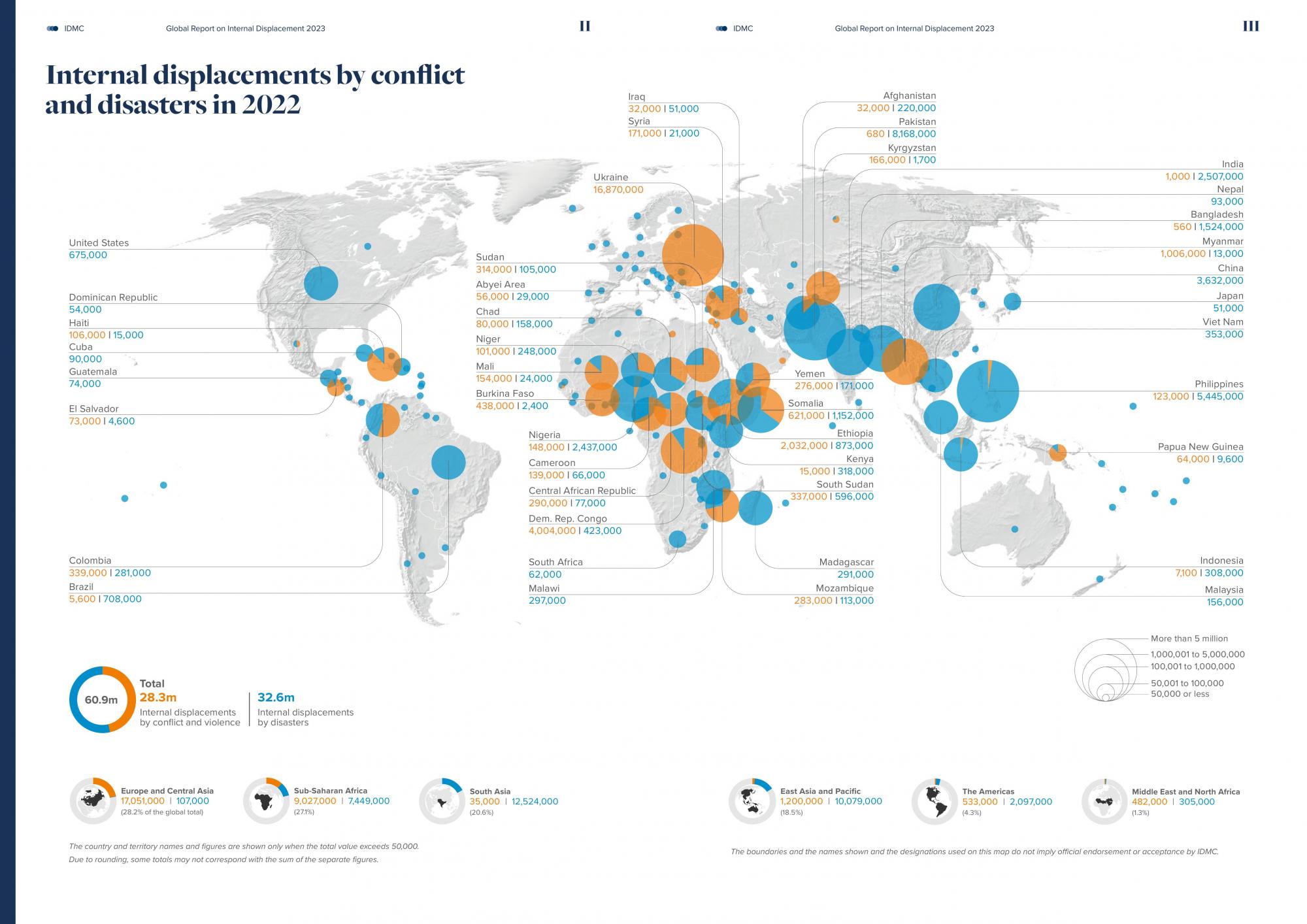 IDMC повідомив, що майже три чверті переміщених осіб у світі проживають у 10 країнах, включаючи Сирію, Афганістан, Демократичну Республіку Конго, Україну та Судан через конфлікти, що викликали значне переміщення у 2022 році.