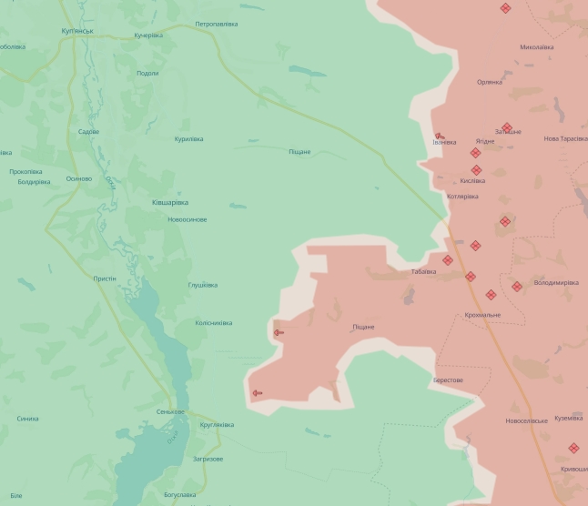 Як зазначається у зведенні, у північно-східній Харківській області російські війська просунулися на захід від села Піщане. Тепер вони займають невеликий виступ за 3,5 км від річки Оскіл.