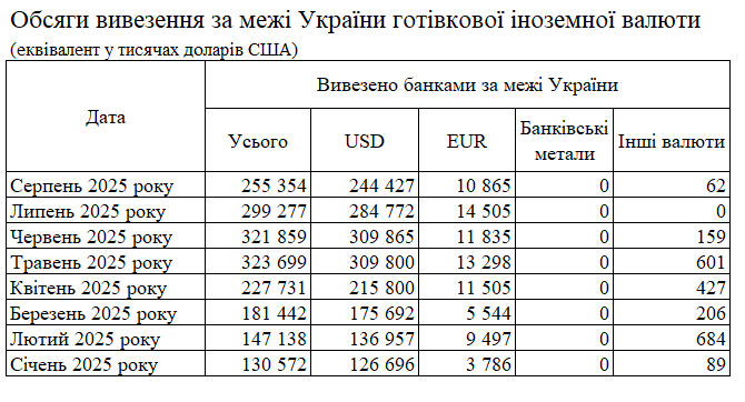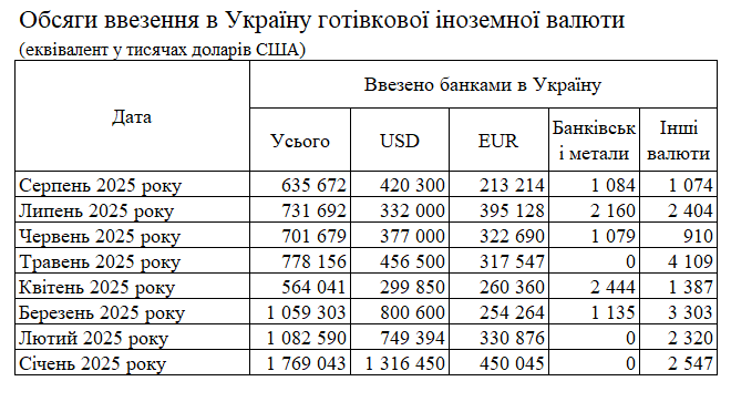 За даними НБУ, обсяг готівкової іноземної валюти, яку банки ввезли в Україну в серпні 2025 року, становив 636 млн доларів.