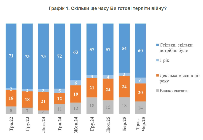 Водночас між березнем і травнем - початком червня 2025 року показник зріс і наразі 60% українців стверджують, що вони "готові терпіти стільки, скільки буде необхідно". Ще 6% готові терпіти 1 рік, тобто відносно довгий період.