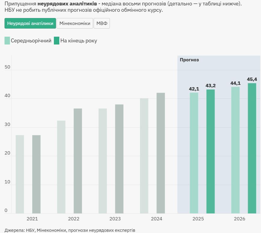 Медіанне значення прогнозів неурядових експертів становить 42,1 грн/долар у середньому за 2025 рік та 43,2 грн/долар на кінець року. Таким чином курс зросте лише на 3%.