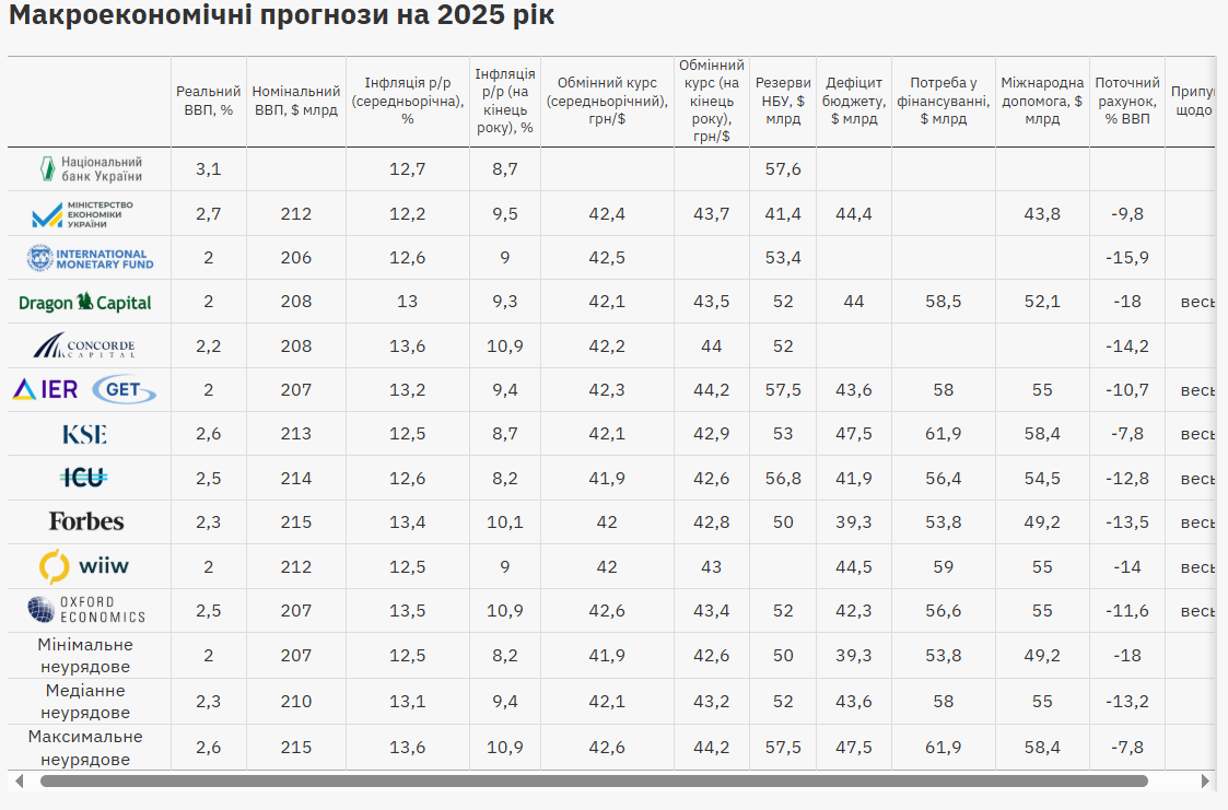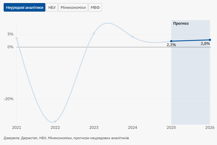 У 2025 році усі неурядові прогнозисти очікують, що зростання реального ВВП уповільниться - розбіг прогнозів зараз 2,0-2,6% з медіанним прогнозом 2,3% проти фактичного зростання у 2,9% у 2024 році.