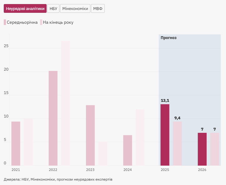 Експерти очікують, що інфляція у 2025 році впаде до 9,4%, у 2026 році - до 7,0%.