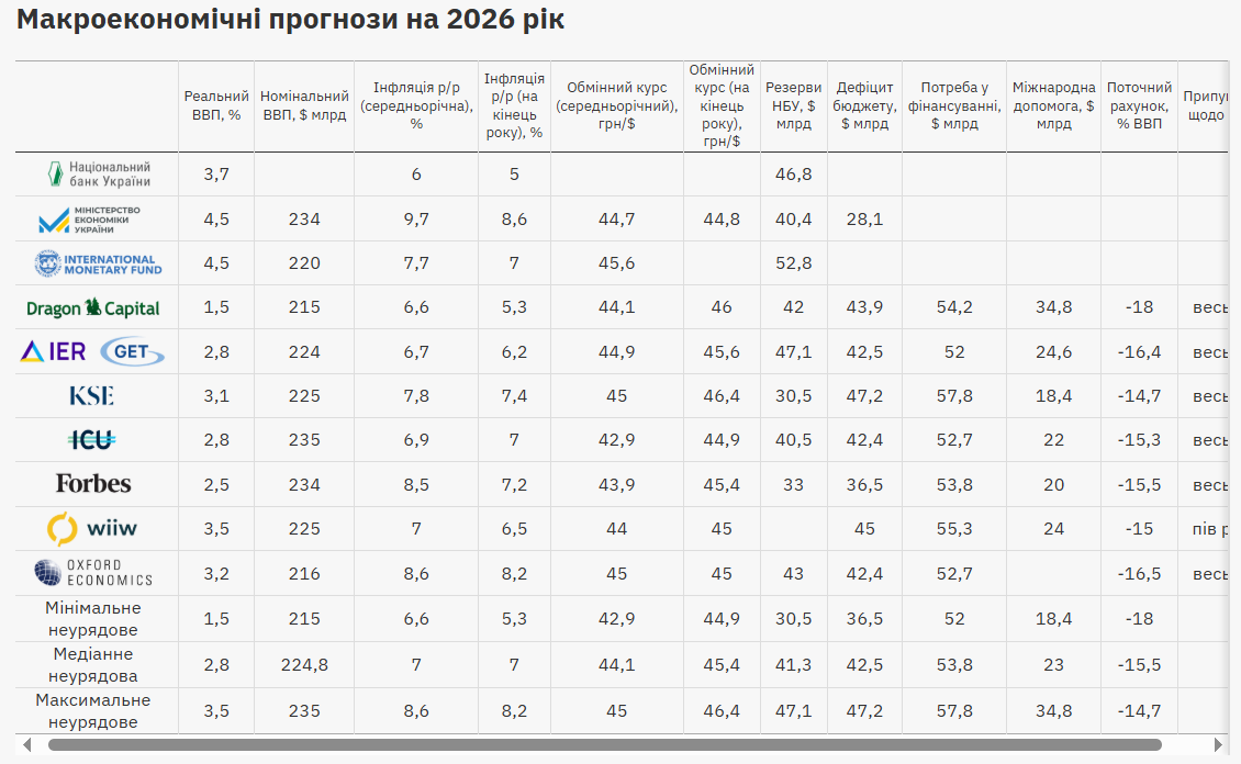 Як зазначив під час презентації Дмитро Круковец, експерт з Київської школи економіки, на 2026 рік прогнози значно різняться через те, що поки що не визначені джерела міжнародної допомоги. Якщо фінансування буде менше, це обмежить здатність НБУ утримувати курс.