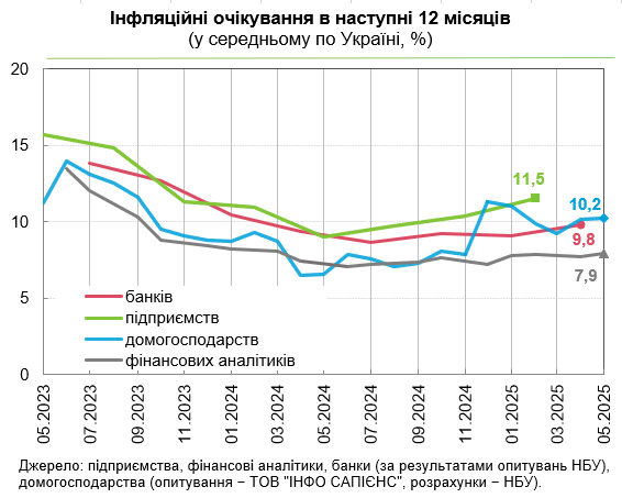 Фінансові аналітики в травні 2025 року погіршили прогноз щодо інфляції до 7,9% протягом найближчих 12 місяців. У квітні вони чекали зростання цін на рівні 7,7%.