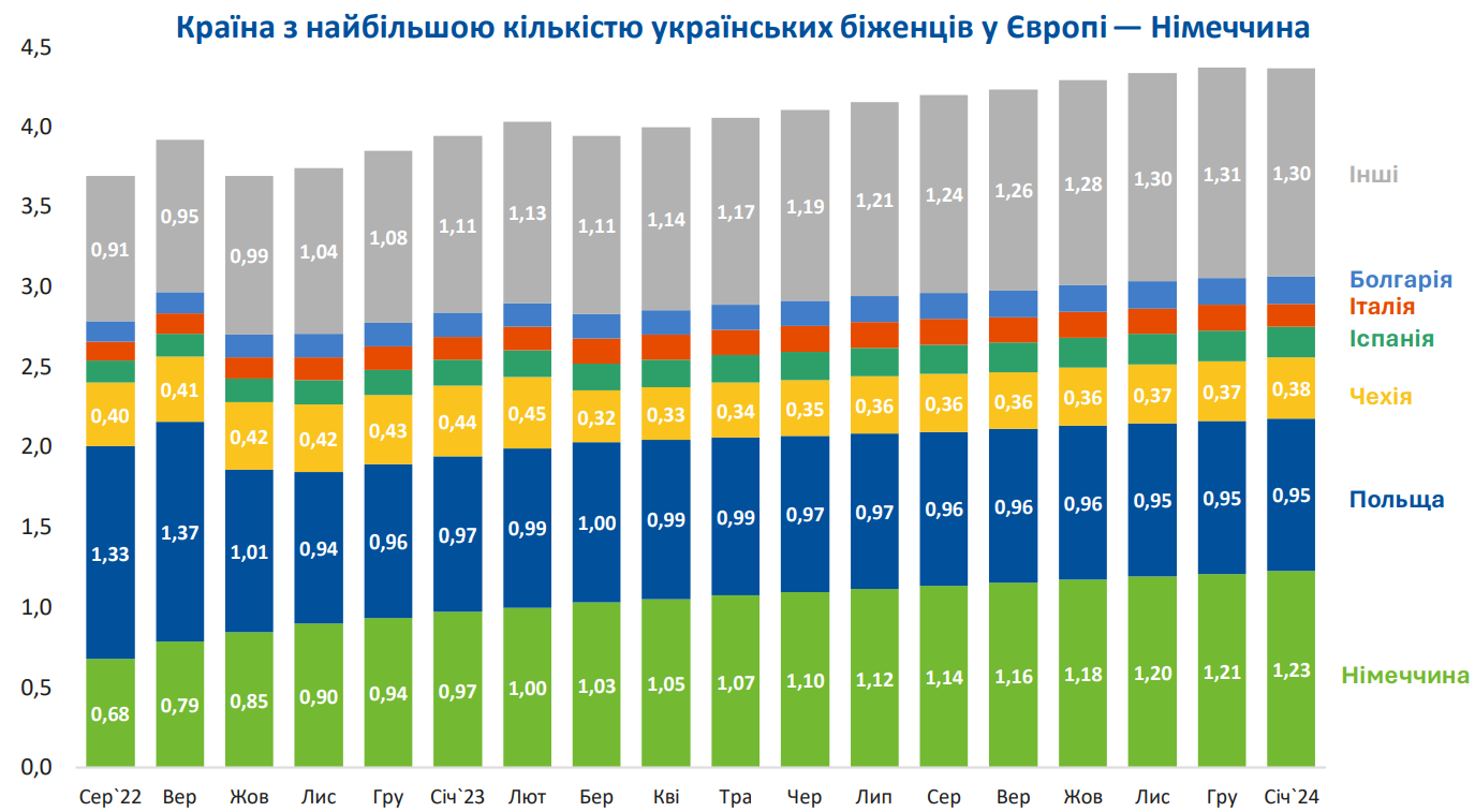 Найбільша кількість українських біженців перебуває в Німеччині - 1,3 млн осіб, Польщі - 951,6 тис. осіб та Чехії - 381,2 тис. осіб.