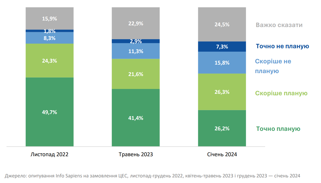 На основі опитування, проведеного Info Sapiens у грудні 2023 - січні 2024 року, 23% біженців не планують повертатися до України, а 25% ще не визначилися зі своїми планами на майбутнє.