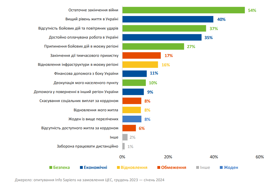 Більшість українських біженців (54%) кажуть, що їх стимулюватиме повернутися до України остаточне закінчення війни. Іншими вагомими чинниками є вищий рівень життя в Україні (40%), припинення бойових дій та повітряних ударів по місту, в яке планують повернутися (37%), можливість знайти добре оплачувану роботу (35%) та припинення бойових дій у рідному регіоні (27%).