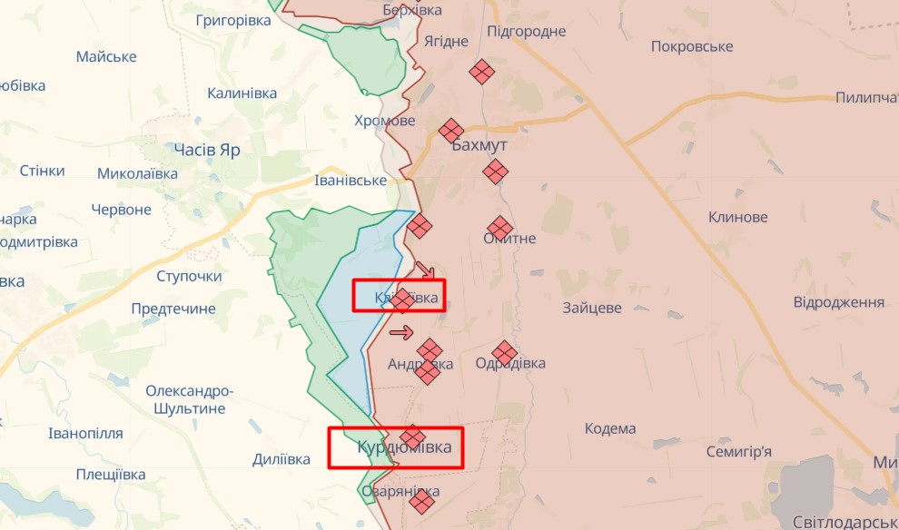 Сили оборони вирівнюють фронт на південь від Бахмута (фото deepstatemap.live)