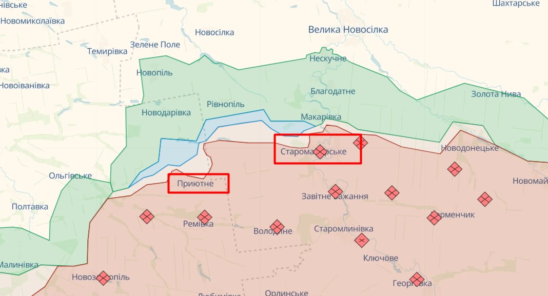 Сили оборони підійшли до Приютного та Старомайорського (фото deepstatemap.live)