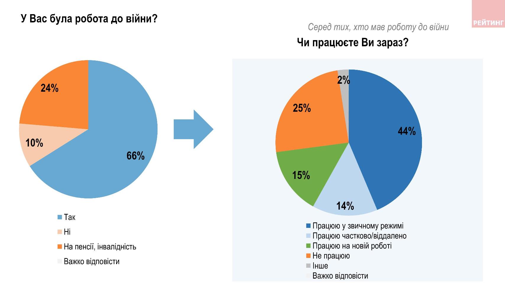 У вересні 2023 року 44% з тих, хто працював до війни, залишилися на своїх звичних робочих місцях, 14% - працюють частково/віддалено, 15% - знайшли нове місце роботи.