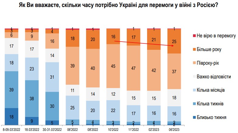 У червні 2023 року більшість (62%) українців вважають, що для перемоги у війні з Росією потрібно не менше півроку або ж і більше часу. У перемогу за кілька тижнів або місяців вірять 20%, не вірять у перемогу лише 1%.